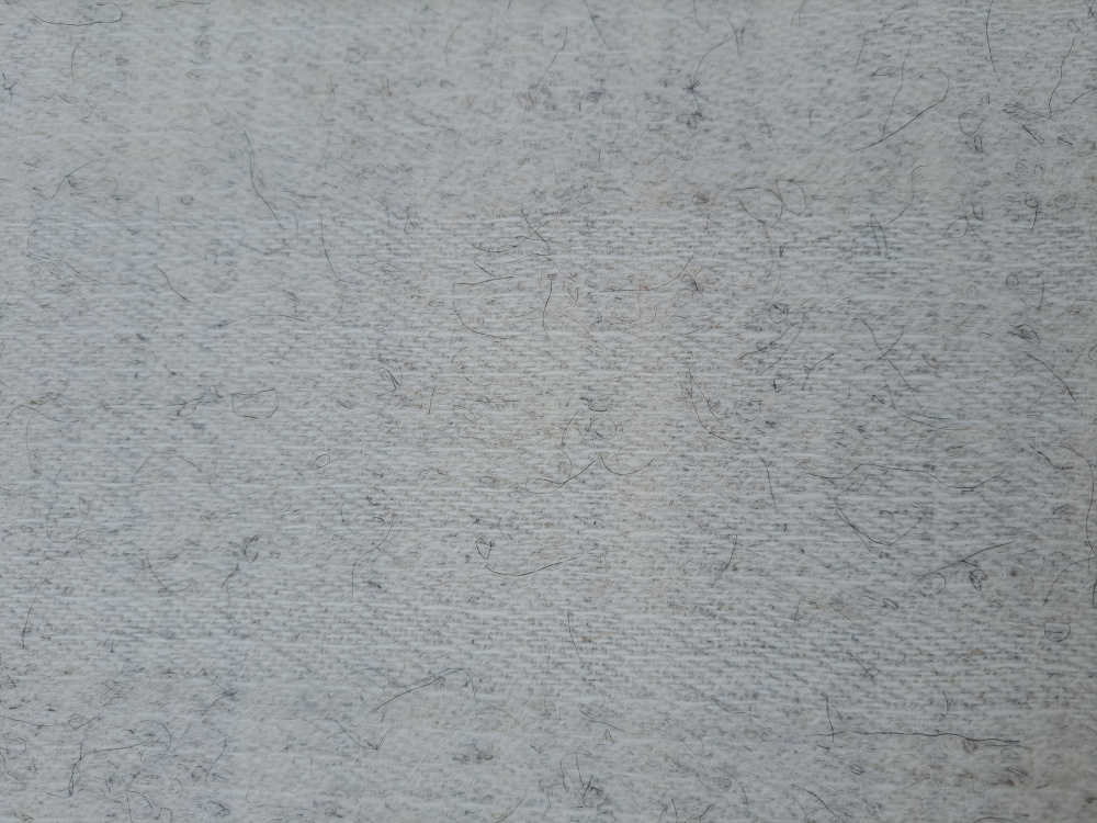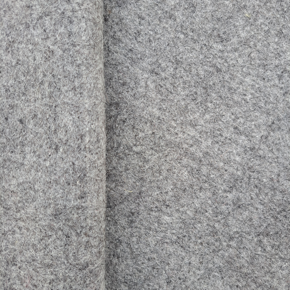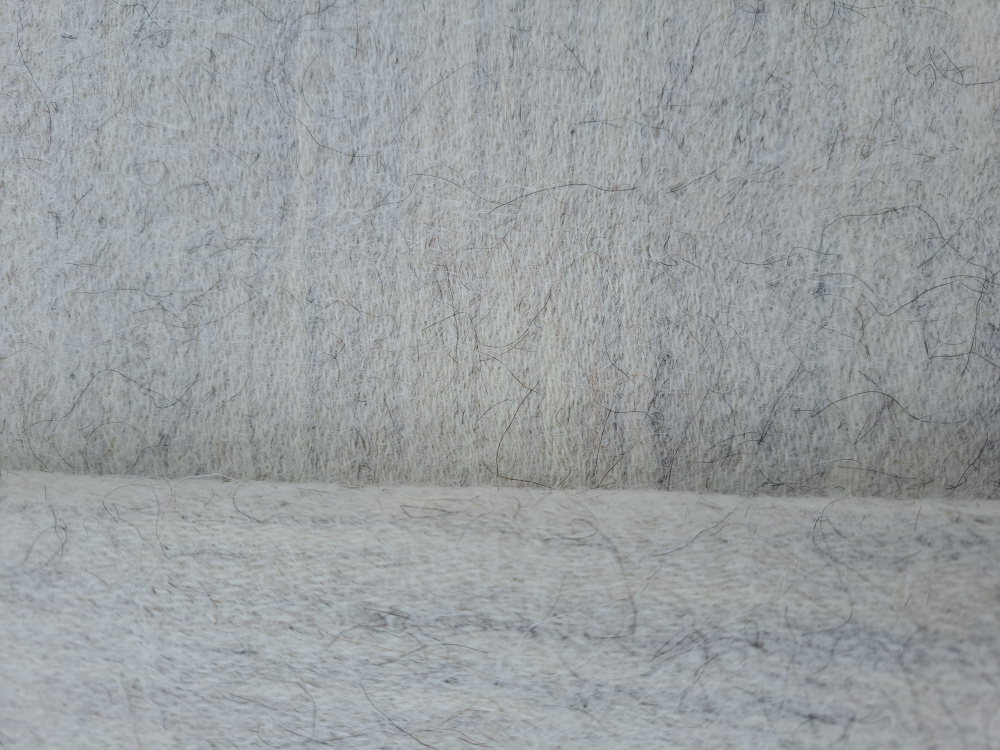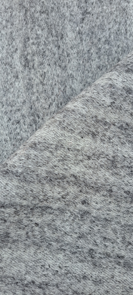 Valka ullstoff i satengbinding. Godt egna til ytterplagg, vinterkjole, putertrekk, vesker. To fargar: Kvitgrå og grå. Bilda viser framside og bakside på stoffa. På det kvitgrå er det med litt av dekkhåra i ulla. Det er med og gjer stoffet liv og karakter. Det grå har ei nydeleg stripete bakside. Vil gje fin effekt å brette opp erme, eller til jakkeslag.